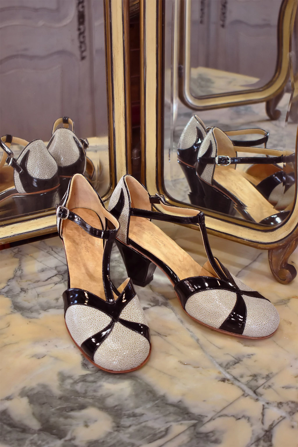 Zapato tipo guillermina confeccionado 100% a mano en cuero de cabra (cabritilla) y charol italiano. Estilo retro, clásico, femenino y elegante.