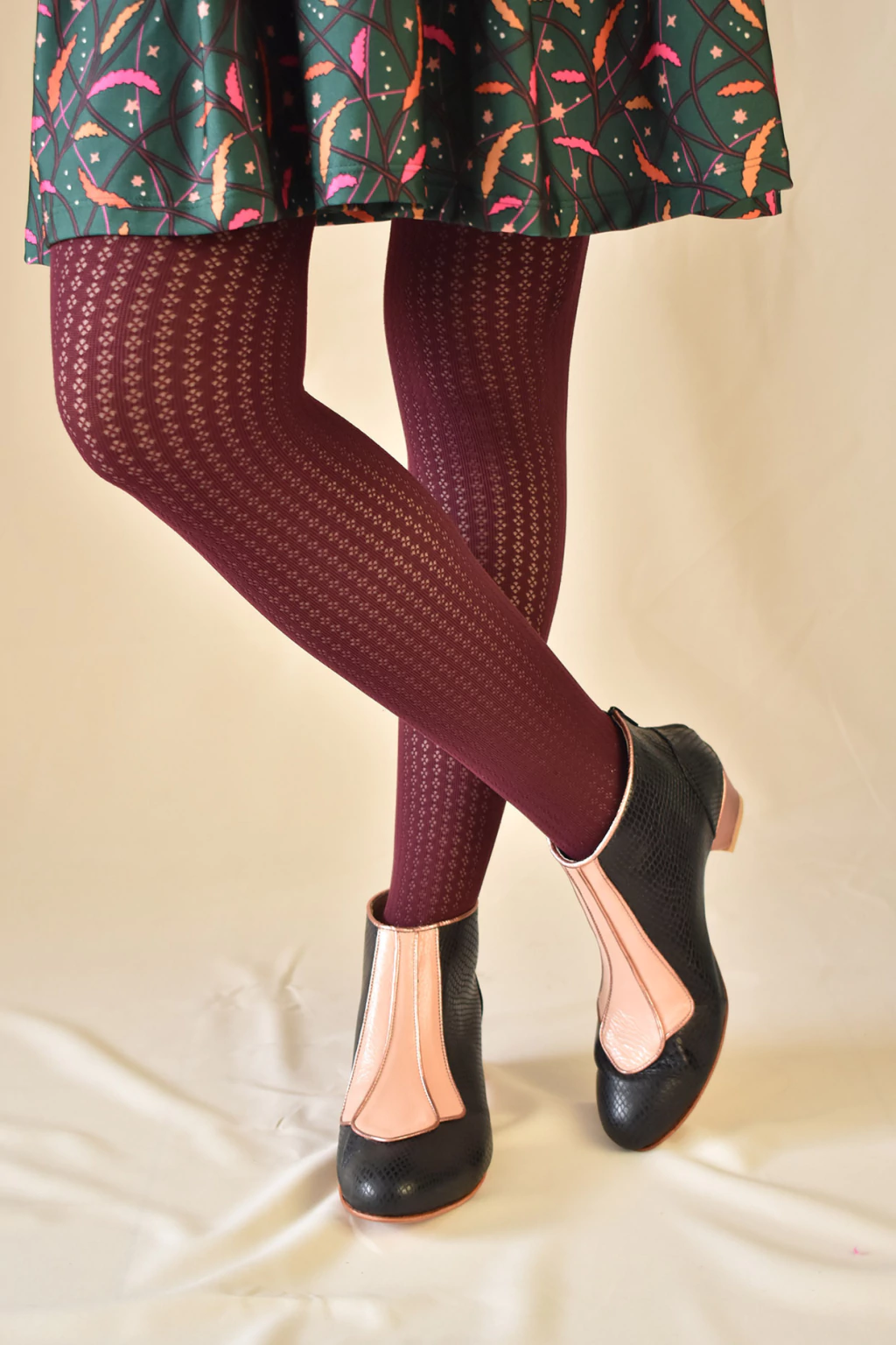 Botineta de cuero de cabra negro transfer, combinada con cuero vacuno rosa nude (detalles del centro) y ribete y taco en cuero vacuno cobre, dandole ese toque unico y protagonista!